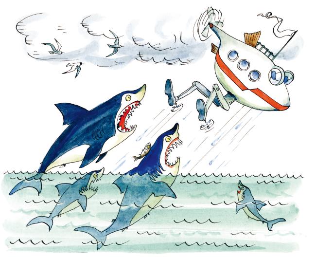 Оказывается, на «Дрындолёт» напала целая стая акул. Огромные рыбины подплывали со всех сторон к бегущему аппарату, пытаясь ухватить его за ноги.