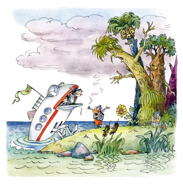 Пират Буль-Буль открыл люк «Дрындолёта», вылез наружу, спрыгнул на жёлтый песчаный берег острова и осмотрелся.
