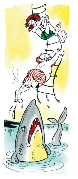 Но географ был уже рядом с воздушным шаром. Крепко вцепившись обеими руками в лестницу, учёный начал быстро-быстро карабкаться вверх. От усталости руки почти не слушались его, а акула была уже совсем близко.