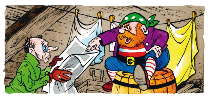– Красота! – потёр руки пират Буль-Буль. – Сейчас набьём наш трюм золотом. Как ты думаешь, где эта портовая крыса хранит свои сокровища?