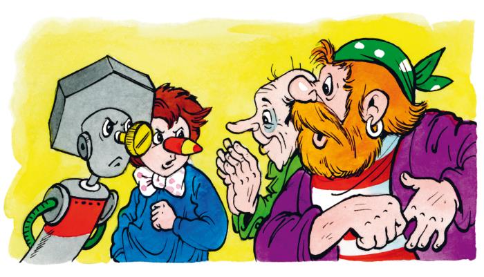 Неподалёку от маленьких волшебников жили два разбойника – толстый бородатый пират Буль-Буль и худенький длинноносый шпион Дырка. Они были злые, жадные и глупые. Больше всего на свете разбойники мечтали поймать Карандаша и заставить его рисовать для них всё, что они пожелают: золото, оружие, пиратский корабль и всякие вкусности.