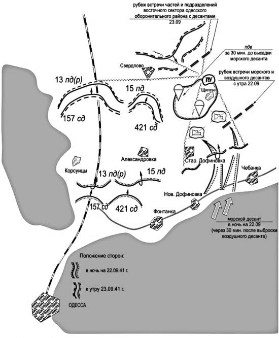 Воздушный десант под Одессой. В результате ожесточенных боев в конце августа 1941 г. гитлеровские части потеснили части Одесского оборонительного района в восточном секторе, в результате чего город, порт и суда в нем оказались под обстрелом вражеской артиллерии, находящейся вне зоны досягаемости большей части средств поражения гарнизона обороняющихся войск (их корабельной и полевой артиллерии). В этих условиях уничтожение дальнобойной артиллерии противника для снижения интенсивности ударов по району обороны, а также объектам инфраструктуры города и порта было возложено на воздушный и морской десанты, выбрасываемые и высаживаемые на направлении атаки частей и подразделений восточного сектора гарнизона города.