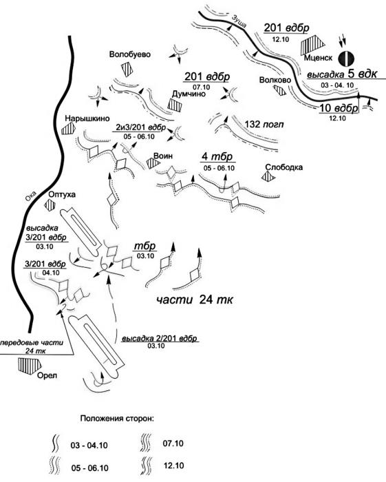 Воздушные десанты в районах Орла и Мценска. В начале октября 1941 г. в ходе наступления противника на Москву создалось тяжелое положение наших войск на орловском направлении в районе Орла и Мценска. Войска противника на отдельных участках упреждали выдвигающиеся резервы наших войск в занятии подготовленных рубежей обороны, обеспечивая беспрепятственное развитие своего наступления в обход Орла на Тулу. Поэтому было необходимо срочно, хотя бы на короткое время, задержать формирования 24‑го корпуса противника до подхода частей и соединений 1‑го гвардейского стрелкового корпуса к Мценску на рубеже между Орлом и Мценском.