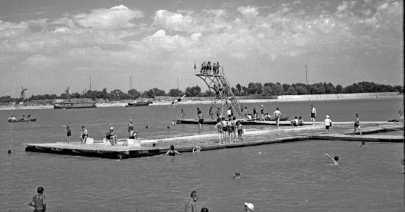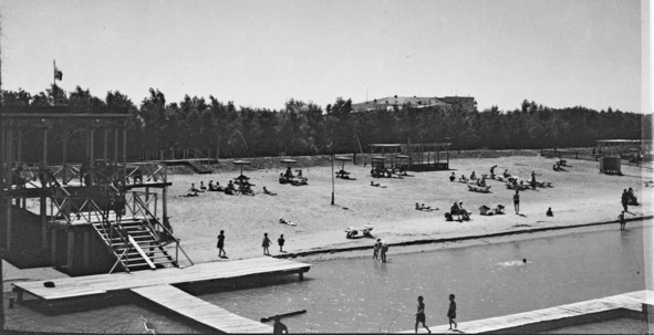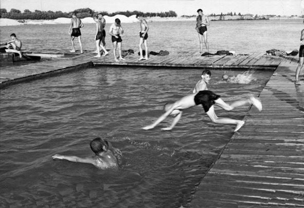 В то время на пляже устраивались самые разные соревнования: по перетягиванию каната, поднятию гирь, лазанью по шесту, игре в волейбол. Любители футбола гоняли мяч на спортивной площадке заводского парка, расположенной рядом. И все же – самыми зрелищными здесь всегда были игры на воде. На плоту, выполненном в виде бассейна с вышкой, заводчане учили своих детей плавать. Подростки, не без риска, подныривали под понтоны, играли таким образом в «чур меня». Ну а те, что постарше, взбирались на вышку и устраивали показательные выступления по прыжкам с высоты в воду. О ходе соревнований извещал репродуктор. Из него же отдыхающие узнавали о новостях в стране, слушали трансляцию популярного в те годы концерта по заявкам радиослушателей.