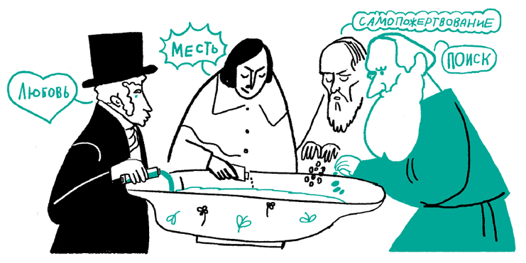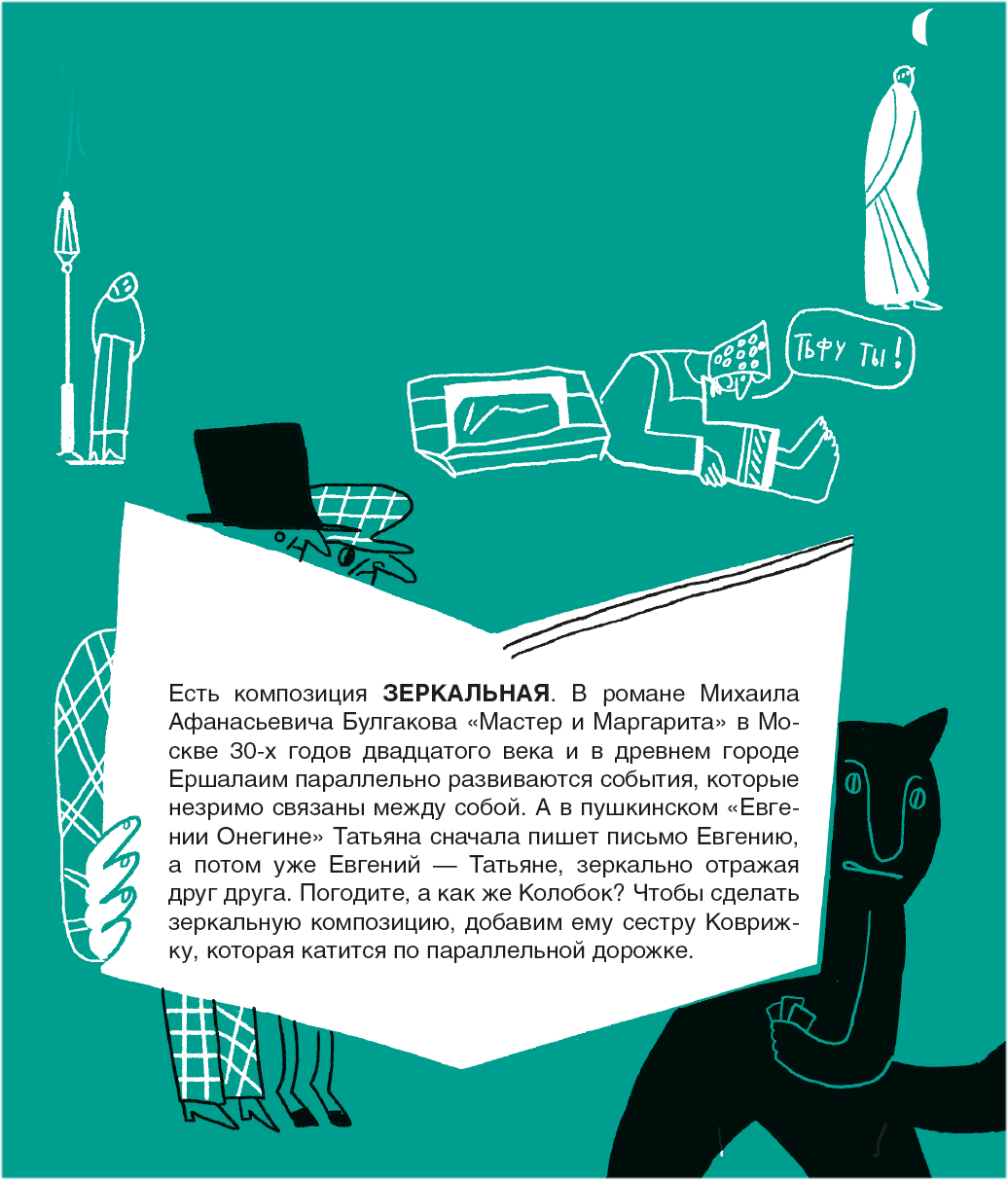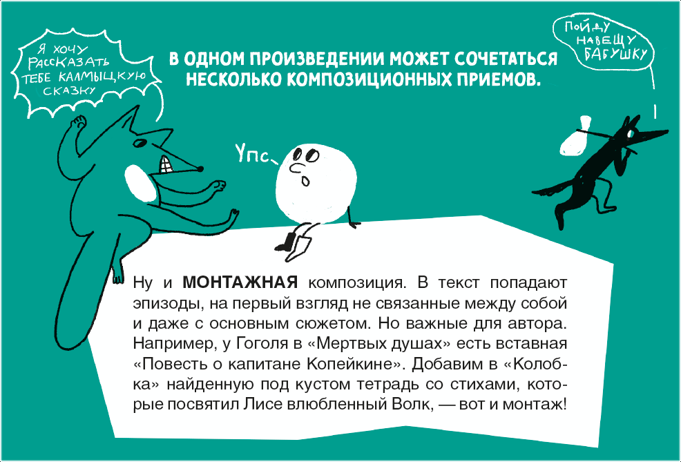 Сюжет – это порядок событий не во времени, а в самой книге. Иногда он полностью совпадает с фабулой – это легко и понятно! Но бывает, писатель все ставит с ног на голову. Например, Лермонтов собирает роман «Герой нашего времени» из пяти повестей, где на первом месте окажутся поздние события из жизни Печорина, а в конце – ранние. Там еще и рассказчики меняются. Если вернуться к Колобку, это все равно что сначала Лиса поведала бы нам о совершенном преступлении, потом мы прочли бы записки Зайца и мемуары Медведя и только потом увидели еще юного Колобка. Но так бы нам стало его еще более жалко! Видимо, этого добивался и Лермонтов – чтобы читатель увидел, как из молодого человека с хорошими задатками получился циничный прожигатель жизни.