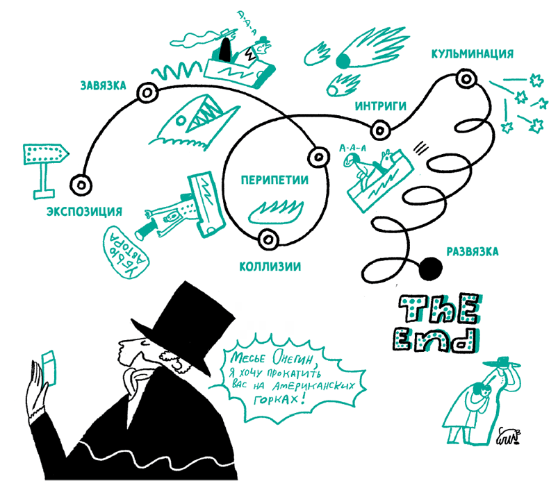 Кстати, кто знает, зачем спрыгнул с окошка бедняга Колобок. Может, ему тоже птичка напела, что он избранный? Конечно, события в произведении – не просто кубики, которые автор от скуки переставляет туда-сюда. Ведь герои для него – живые! Они страдают, переживают, радуются! Читатель радуется и страдает с ними вместе. Если, конечно, автору удалось его увлечь. А как побудить человека испытать яркие эмоции? Прокатить на аттракционе: «Ой, что сейчас будет! Ах, вверх-вниз! Ух, вправо-влево! Ой, сейчас упаду… Ох, приехали! Все, выходим».