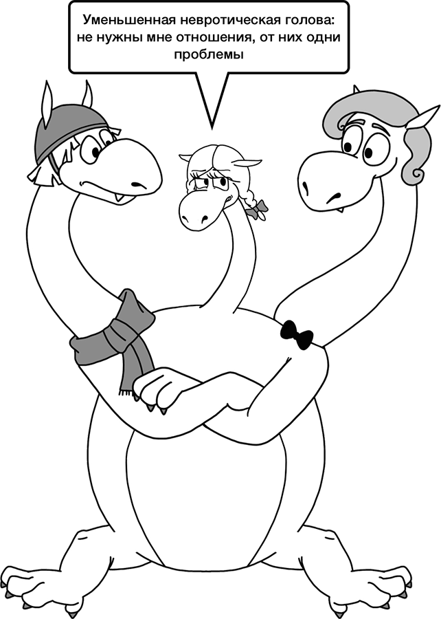 Если невротическая голова, отвечающая за построение отношений, самая большая из трёх, раздутая, то человек на первое место в своей жизни ставит отношения.