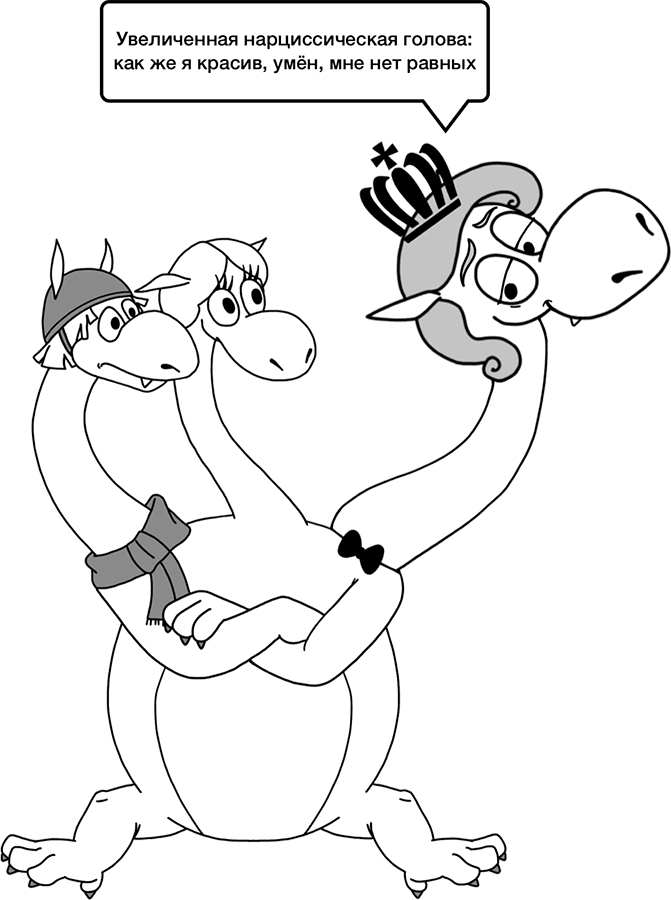 Если нарциссическая голова больше, чем две остальные, то человек бесконечно хвастается, постоянно со всеми конкурирует, всё время пытается возвыситься над другими, обсмеять других. Человек изо всех сил пытается получить комплименты, признание.