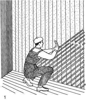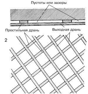 Деревянные поверхности подготавливают под оштукатуривание путем прибивания штукатурной драни. Первый слой драни, накладываемый непосредственно на основание, называется простильным рядом, верхний – выходным. Оба ряда драни взаимно перпендикулярны, а образуемые между ними ячейки должны иметь размер 45×45 мм. Перед набивкой дрань необходимо рассортировать: для простильного ряда толщина драни 3–4 мм, а для выходного – 4–5 мм. Ширина драни должна быть 15–20 мм. Дрань к стенам и потолкам крепится штукатурными гвоздями (через одно пересечение драниц – на потолках и через два пересечения драниц – на стенах).