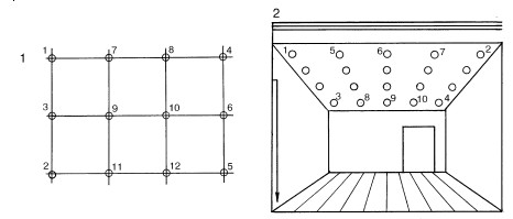 1 – последовательность провешивания стен; 2 – последовательность провешивания потолков
