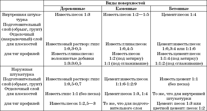 В зависимости от поверхности, подлежащей оштукатуриванию, подбирают соответствующие вяжущие материалы в соответствии с табл. 1.
