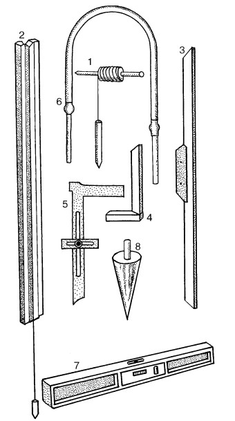 1 – отвес; 2 – рейка с отвесом; 3 – контрольное правило; 4 – угольник деревянный; 5 – угольник металлический с подвижной планкой; 6 – уровень водяной (гибкий); 7 – уровень строительный; 8 – стандартный конус