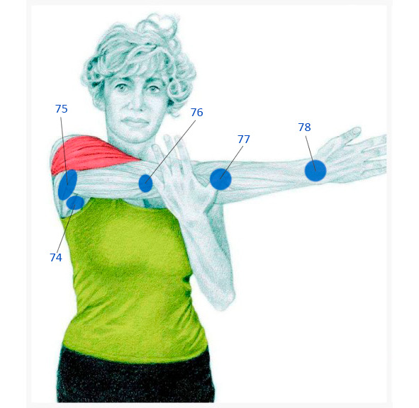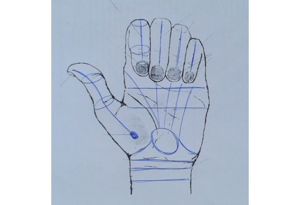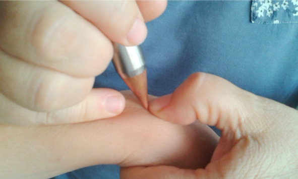 – Фіксувати точку впливу між двома пальцями іншої руки як показано на малюнку. В разі, якщо неможливо фіксувати точку впливу (наприклад маніпуляція виконується на своїй руці), на цьому не слід зосереджуватись.