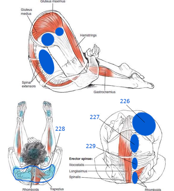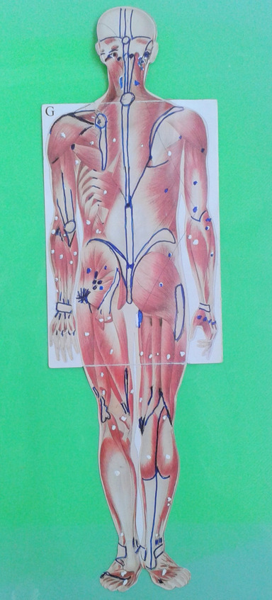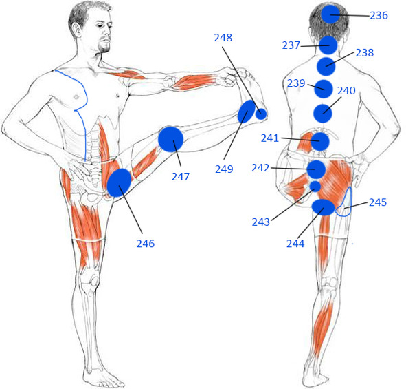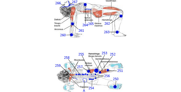 Спазми м’язів виявляються за допомогою пальпації симетричних ділянок тіла. Проявляються вони як болючі ущільнення в середині м’язу. При пошуку такого ущільнення слід зважати на анатомію та місця прикріплення кожного м’яза. Характер ущільнення пов’язаний з функцією та кількістю точок його фіксації. Спазм в довгих м’язах спини, наприклад в багато роздільному м’язі, нагадує веретеноподібне повздовжнє стовщення, довжиною в 2—3 тіла хребців (на рівні яких він знаходиться), а спазм брюшистих м’язів розповсюджується на все брюшко одночасно.