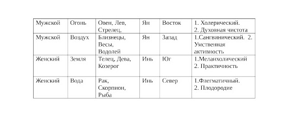 Таблица №1. Знаки зодиака по сторонам света и стихиям.