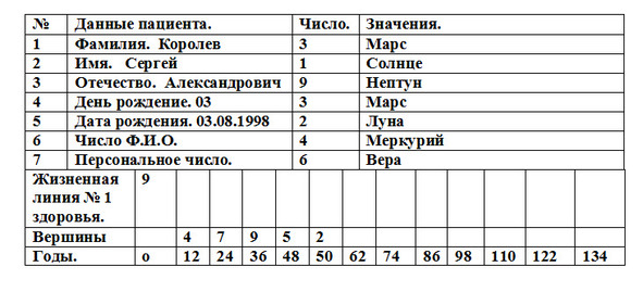 12.15. Диагностическая карточка пациента. Вымышленный пациент. Королев Сергей Александрович дата рождения 03.08.1998 г. И когда будет заполнена вся карточка, то будет видно, какие проблемы у пациента. И что ему и целителю необходимо сделать, чтобы пациент был здоров. И чтобы у пациента в дальнейшем было, максимально меньше проблем.