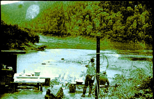 Слева впадает Казырсуг, справа – Большой порог, сверху на нас течет Енисей. Григорий Никифорович Соколов пьет чай– мы только пришли с Казырсуга. Сухомятов дядя Саша, сидя на чурке, порет вечерний улов харюза.