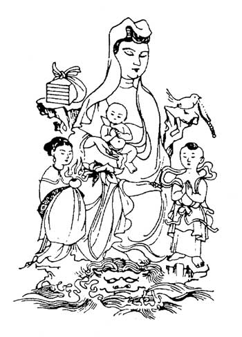 Сходный образ благостной богини известен и в китайской культуре. Это – покровительница семейного очага богиня Гуаньинь; ее каноническое изображение в окружении детей очень напоминает вышеприведенные рисунки Золотой Бабы, сделанные европейскими картографами. Впервые оригинальную гипотезу о возможной связи Золотой Бабы с буддийской богиней Гуаньинь высказал поэт и прозаик Сергей Николаевич Марков в интереснейшей книге «Земной круг», посвященной освоению Севера. Ее культ достаточно сложен и распространен в Китае, Корее и Японии. Не касаясь сложных и запутанных метаморфоз буддийского пантеона, обращаю особое внимание, что даже в каноническом изображении Гуаньинь – любимая богиня китайского народа – очень даже напоминает известные описания Золотой Бабы. Благостная Гуаньинь – покровительница женщин, подательница детей и родовспомогательница. Вместе с тем она защищает всех без исключения людей и без различия их пола от подстерегающих бед и опасностей.
