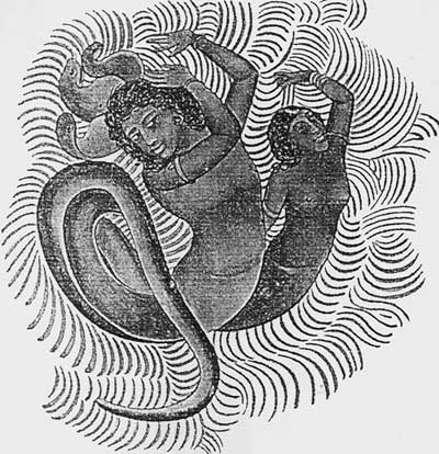 [Закрыть]. Согласно древним канонам, они всегда изображались в виде человекоподобных существ с переплетенными змеиными хвостами. Аналогичную взаимосвязь змеиного (мужского) и людского (женского) начал наглядно выражает тантрический рисунок, на котором мужская творческая энергия в виде фаллоподобной кобры вползает (выползает) во влагалище индуистской богини. Средиземноморская эллинистическая традиция вообще отбросила какую бы то ни было человеческую атрибутику и ограничилась в герметическом символе кадуцея одними лишь переплетенными змеями. В предельно абстрактной форме эту же фундаментальную идею выражает знаменитая восточная идея единения Женского и Мужского начал – инь и ян – и соответствующая ей всем хорошо известная пиктограмма.