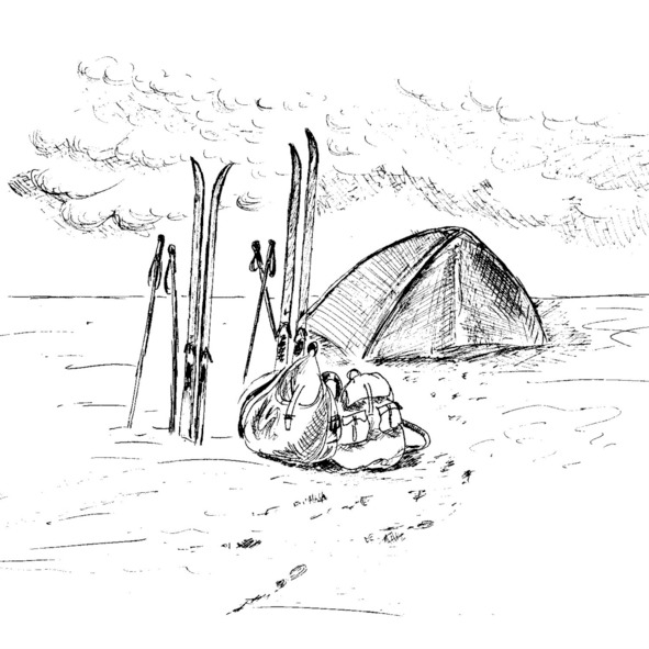 Часам к пяти «альпинисты» вышли на точку. Солнце быстро катилось к горизонту. Солнце ниже – температура ниже. Пора было ставить палатку и запускать примус. Встали. Сняли рюкзаки, достали валенки, переобулись. Собрали палатку. Палатка – двухслойная тканевая пирамида со стальными прутьями – рёбрами жёсткости. Закрепили её, закрутив в лёд десятисантиметровые винты-ледобуры. Сложили в палатку вещи.