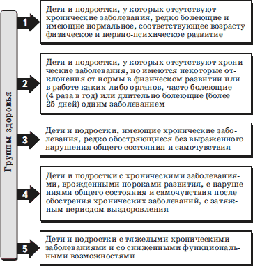 В соответствии с этими критериями все дети и подростки по состоянию здоровья могут быть разделены на пять групп здоровья (схема 17).