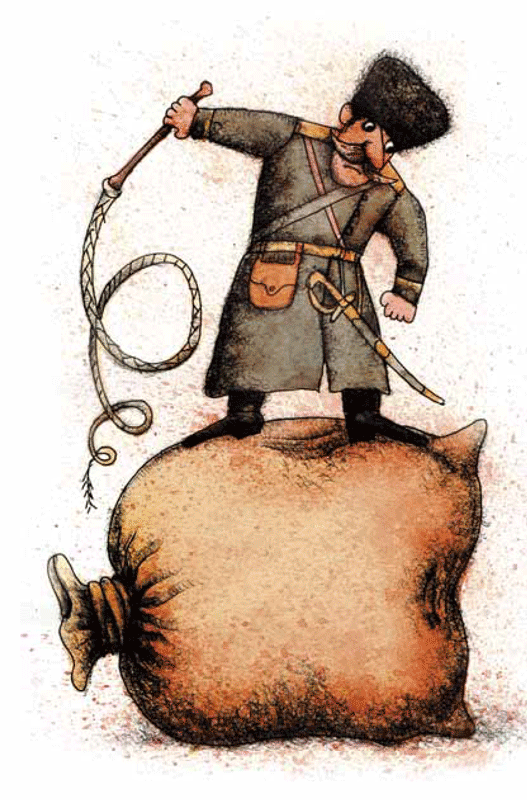 В назначенный день к сварливой бабе-старосте и впрямь является от государя казак. У казака есть нагайка на случай небольших налоговых недоимок и есть шашка на тот случай, если налоги не собраны вовсе или не собираются регулярно.