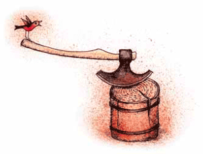 Ни один человек не может удержаться от попытки прихватить топорик с собой. Человек хватается за топорище, рука его прирастает к рукоятке намертво и начинает золотеть. А Лихо уж рядом. Сейчас схватит и сожрет. Тут нельзя терять ни минуты. Вынуть нож из кармана и отрезать себе руку – это и есть страшный налог. Нанеся себе увечье, отдав руку, ногу или глаз Лиху, человек научается управляться с Горем и Счастьем. Такова цена.