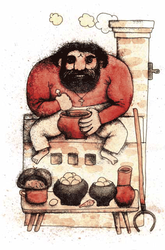 А некоторое время спустя баба идет месить хлеб, видит в квашне рака и ужасно пугается. Выбегает на улицу, кричит, созывает всю деревню и сетует, что в квашне у нее, дескать, завелся черт.