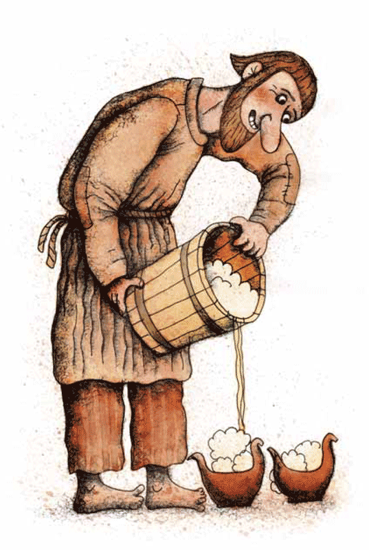 И вот приходит к нему старик, калика перехожий, и просится на ночлег. Бедняк, разумеется, калику в дом пускает, но предупреждает заранее, что есть в доме нечего, а назавтра на праздник не будет и пива. Калика говорит: не тужи, пойди к богатому соседу, займи четверик (примерно два ведра) солода, и наварим с тобой пива.