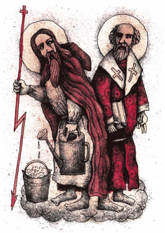Вот, например, живет себе мужик, особо почитающий Николу-угодника и совсем не почитающий Илью-пророка. И вот вырастает у этого мужика прекрасный урожай пшеницы. Никола-угодник радуется, глядя на мужиково поле и предвкушая богатые после сбора урожая дары. А Илья-пророк гневается: ведь хороший урожай во многом определяется дождями, которыми пророк ведает. Мужик, который, вырастив хороший урожай, не ставит дорогих свечек Илье-пророку, на взгляд святого, уклоняется от уплаты налога на дождь.