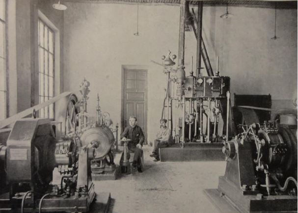 [Закрыть]. К 1899 г. состав паросиловой станции был следующим: две паровые машины общей мощностью 103 л. с., две динамо-машины, электрическая нагрузка – 1 дуговой фонарь, 300 ламп накаливания, 5 служащих на станции.
