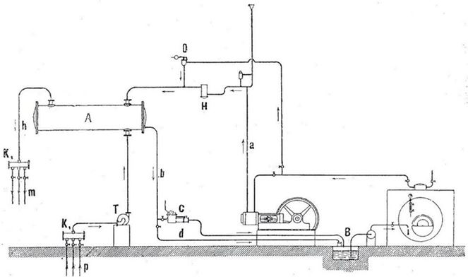 Пар после паровой машины при давлении около 1 ати поступает по паропроводу а через маслоотделитель Н в трубки змеевика конденсатора пара А, установленного в машинном зале. Образующийся конденсат отводится по конденсатопроводу b через конденсатный горшок (конденсатоотводчик) с в заглубленный атмосферный бак В – сборник конденсата, и питательным насосом подается в паровой котел. При недостаточном расходе выхлопного пара свежий пар от котла дросселируется в клапане D и смешивается с выхлопным паром паровой машины. Обратная вода после охлаждения в приборах отопления через обратный коллектор К1 подается на всас циркуляционного насоса Т и далее в межтрубное пространство конденсатора А. Подогретая вода подается под давлением напорной линии через теплопровод h в прямой коллектор К2 и далее по подающим линиям контуров систем отопления в приборы отопления помещений. В схеме для аварийной ситуации предусмотрен выпуск выхлопного пара в атмосферу и слив конденсата по линии d напрямую из конденсатора А в конденсатный бак В.