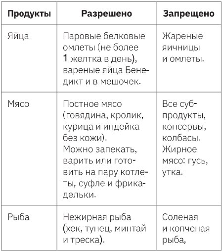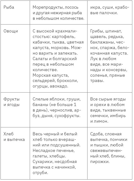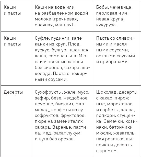 Таблица разрешенных и запрещенных продуктов