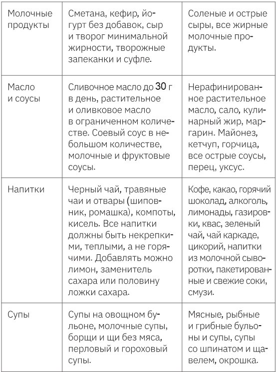 Как упоминалось ранее, в данной диете есть разрешенные и запрещенные продукты, что напрямую обусловлено необходимостью разгрузки ЖКТ.