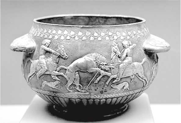 Сосуд со сценами охоты. IV в. до н. э. Серебро, позолота. Найдено на раскопках 1913 года в кургане Солоха (Приднепровье)
