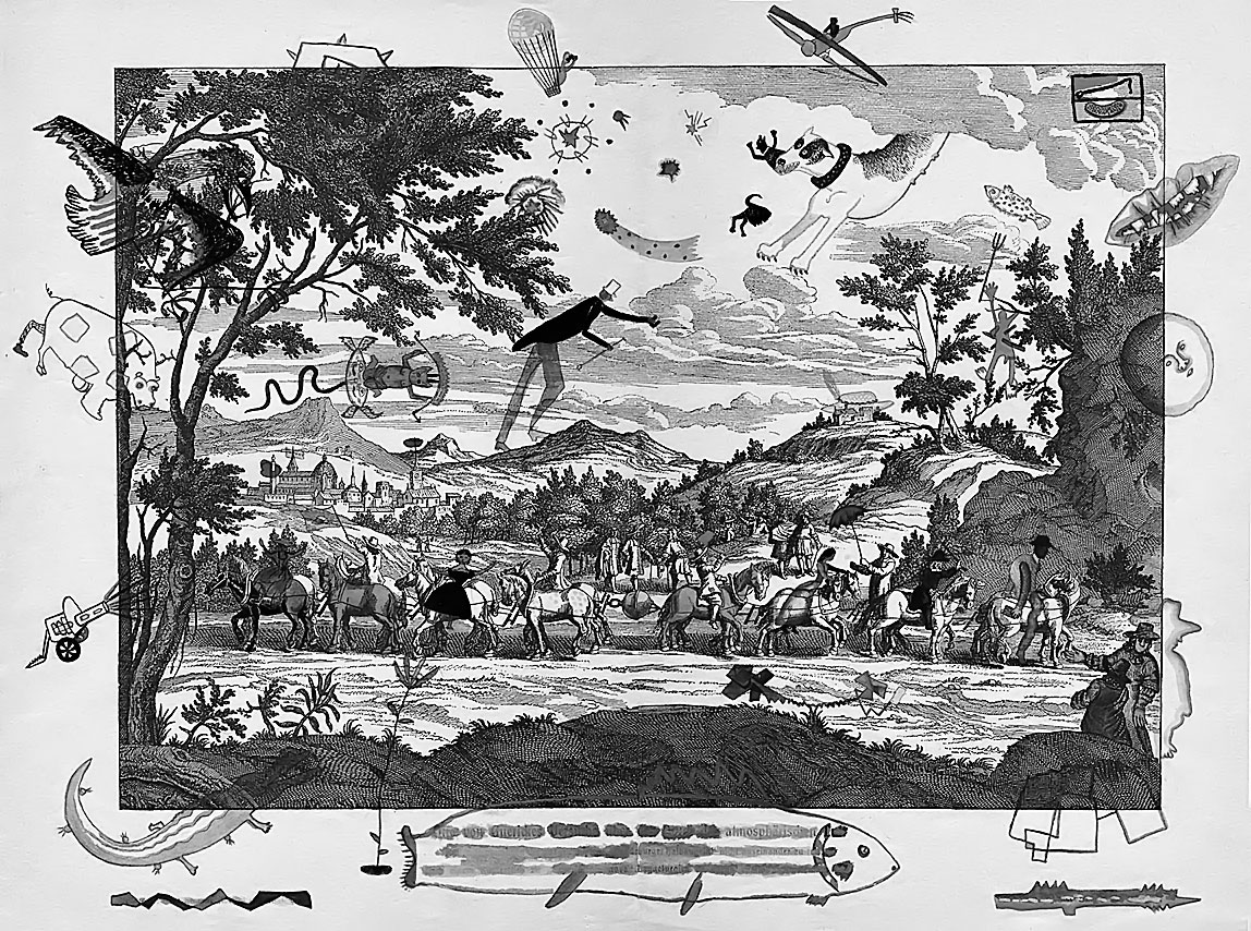 “Опыт с магдебургскими полушариями”. Рисунок А. Порет и Д. Хармса поверх репродукции гравюры 1654 г. Акварель, цветная тушь по типографскому отпечатку, 1932–1933 гг.