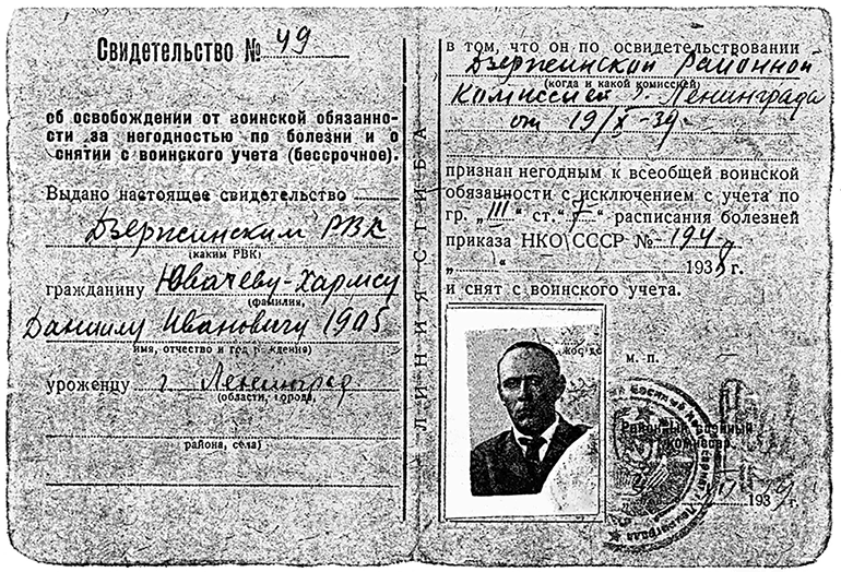Свидетельство об освобождении от воинской обязанности, выданное Даниилу Хармсу 19 октября 1939 г. Сохранилось в составе следственного дела Д. Хармса 1941 г.
