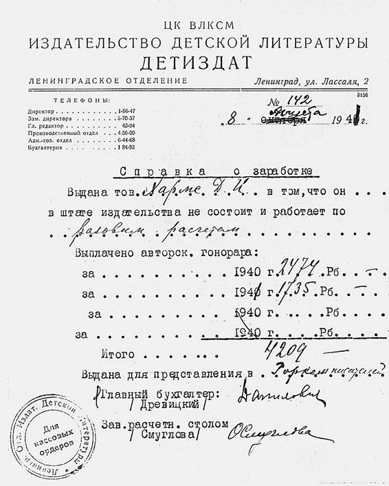 Справка о заработке Д. Хармса в 1940–1941 годах. Сохранилась в составе следственного дела Д. Хармса 1941 г.