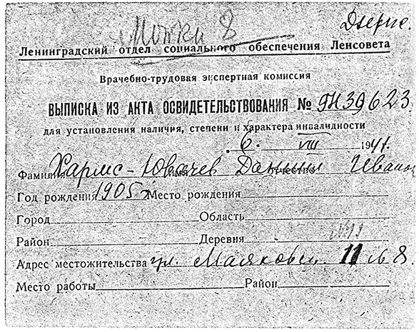Впрочем, сухая справка, выданная нервно-психиатрическим диспансером Василеостровского района, опровергает выразительный рассказ жены писателя. Она гласит, что гражданин Ювачев-Хармс Даниил Иванович находился на обследовании с 29 сентября по 5 октября 1939 года.