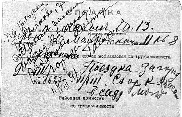 Справка о мобилизации, выданная Марине Малич. “Поездка за город 11/VII. Сбор к 2 часам в саду МОПР”. Резолюция: “По разрешению т. Сычкова, гр. Малич заменить выезд за город работами внутри города. 11/VII-41”.