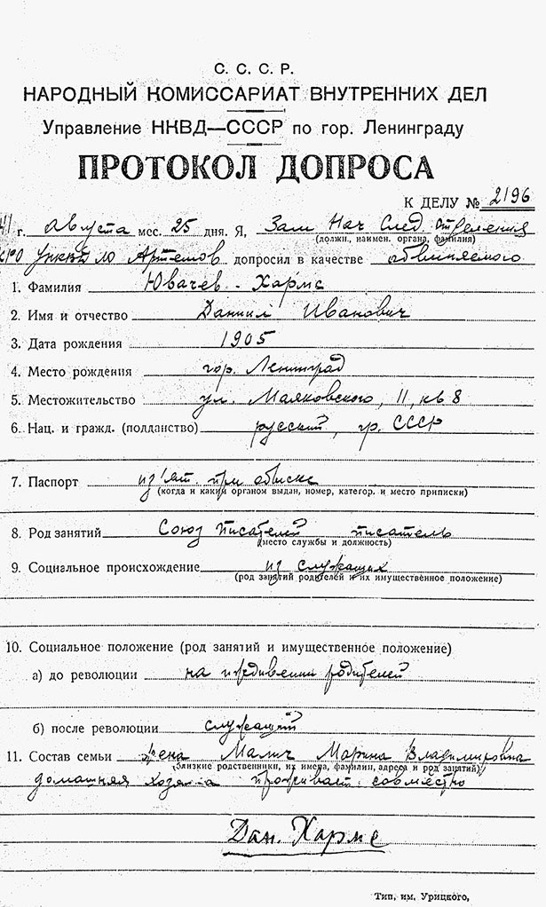На следующих страницах: анкета арестованного, 23 августа 1941 г., протокол допроса Даниила Хармса, 25 августа 1941 г.: