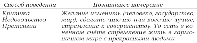 Критика, как и любое другое поведение, имеет свои позитивные намерения. Когда мы критикуем какого-то человека, мы хотим, чтобы он стал лучше, чтобы изменил своё поведение. Когда мы критикуем правительство, то хотим, чтобы оно было совершеннее. Наши намерения прекрасны.