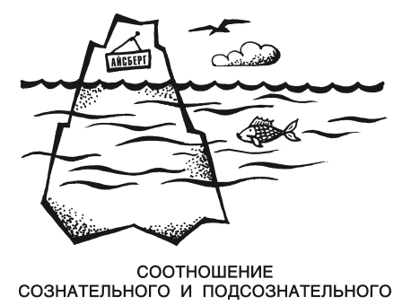 Схематично можно представить соотношение сознательного и подсознательного в виде айсберга. Над поверхностью воды находится сознательный разум. Всё остальное расположено под водой – это и есть подсознание. Представляя этот айсберг, можно понять огромную значимость подсознания в жизни человека.