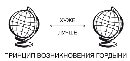 Если рассмотреть рисунок, на котором изображены два глобуса, две планеты, становится понятно, что планеты-глобусы притянулись друг к другу потому, что у них было обоюдное стремление. До тех пор, пока люди, общаясь, принимают друг друга смиренно, то есть с миром, у них складываются прекрасные отношения. Проблемы возникают тогда, когда мы начинаем оценивать других и себя с позиции «ХУЖЕ – ЛУЧШЕ». Как только возникает идея сравнить и осудить кого-либо исходя из этой позиции, это автоматически приводит к гордыне. Как мрачно шутят врачи: вскрытие показало, что гордыня бывает двух видов – тираническая и жертвенная.