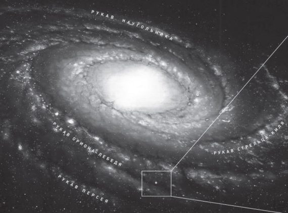 Вот так схематично выглядит наша планетная система Галактика (Млечный Путь), в которой вращается Солнце вместе с другими планетами. Кружочком в квадратике показано примерное место расположения нашей Солнечной системы.