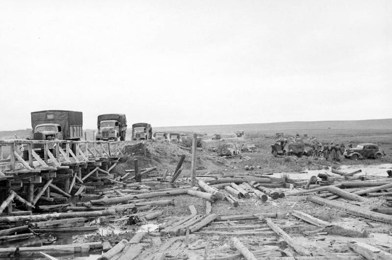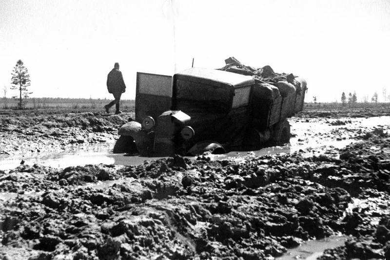 Весна 1943 г. выдалась ранней. Так выглядели дороги и в районе Курской дуги. (РГАКФД)