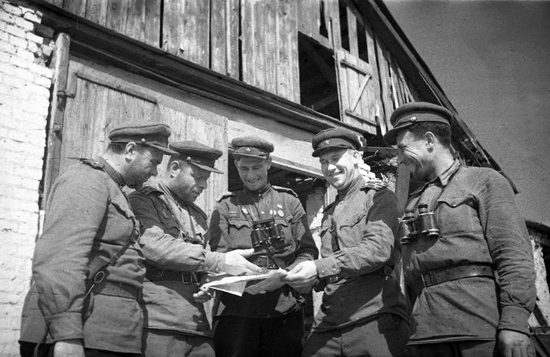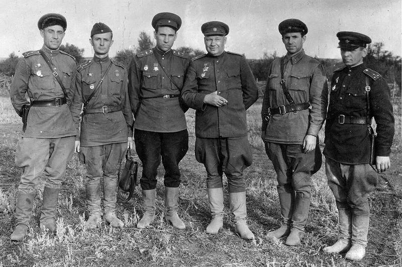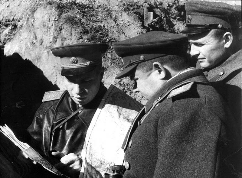 Командир 305 сд полковник А.Ф.Васильев (второй справа) с группой командиров соединения на своем НП в районе с. Шляховое обсуждает результаты боя. Июль 1943 г. (РГАКФД)