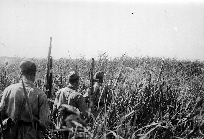 Бойцы боевого охранения одной из дивизий первого эшелона 7 гв. А идут на смену по пойме р. Северский Донец. Июнь 1943 г.(РГАКФД)