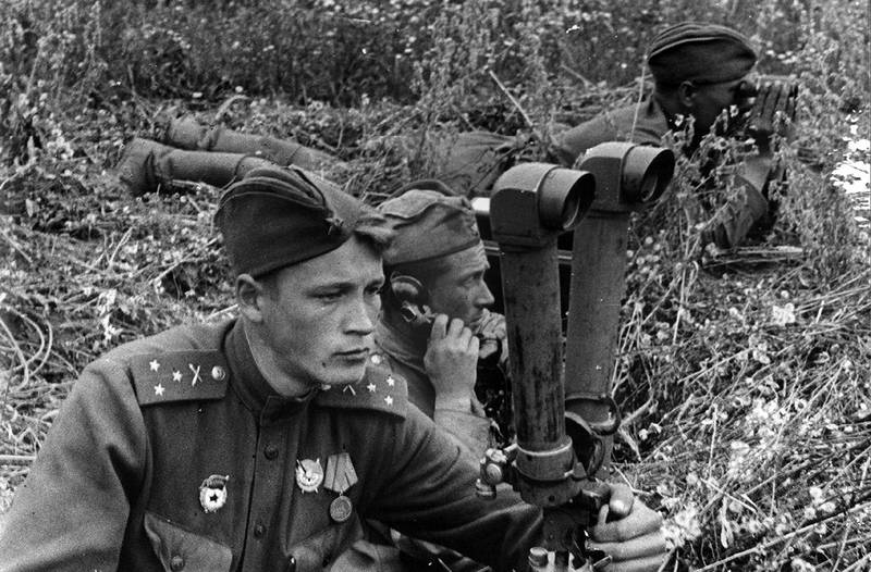 Старший лейтенант В.М. Моисеев, командир одной из артиллерийских батарей 7 гв. А ведет наблюдение с использованием стереотрубы БСД. Белгородское направление. Воронежский фронт. Июль 1943 г. (РГАКФД)