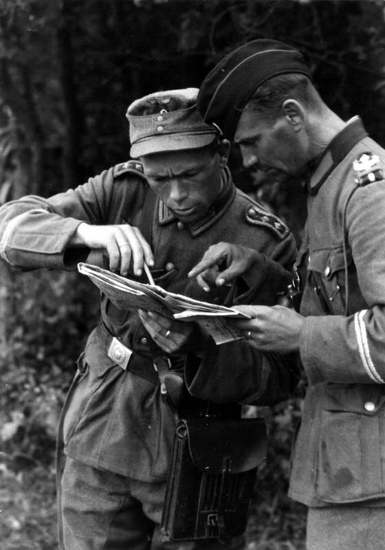 Военнослужащий РОНА (Русской освободительной народной армии) казачьей роты 3 тк (справа), которая использовалась в ходе операции «Цитадель» для уничтожения пунктов управления советских войск и связи, уточняет боевую задачу у фельдфебеля вермахта. Июль 1943 г. (Bundesarchiv)